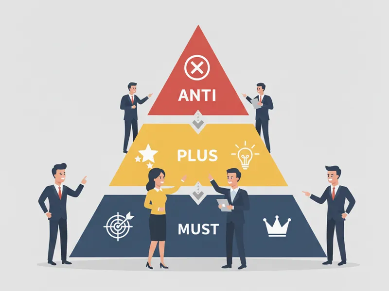ペルソナ設計は「どのような人物像が組織で機能するか」を示す作業です。ここで推奨するのは、Must(必須)/Plus(加点)/Anti(除外)の三層で要件を整理する方法です。