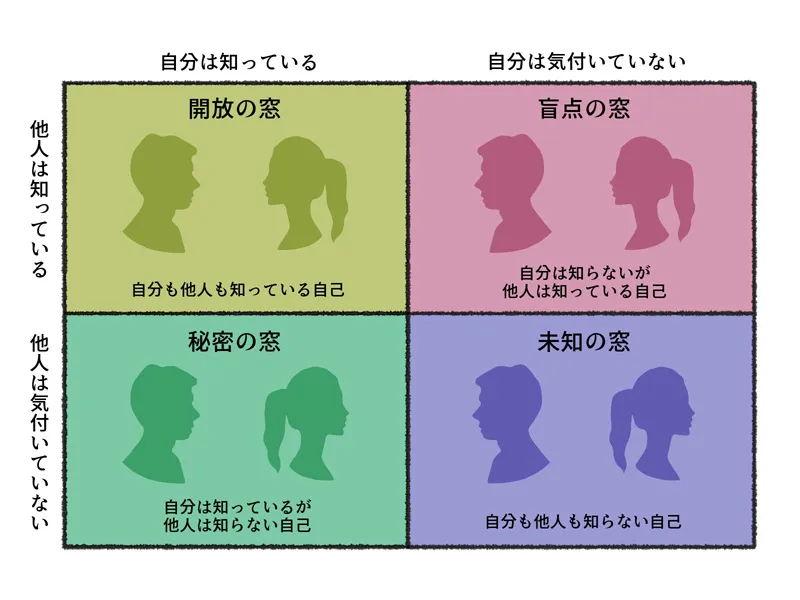 自己分析のモデルとして有名な「ジョハリの窓」で考えると分かりやすいでしょう。